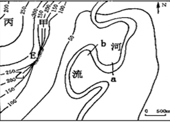 (1) 图中甲、乙两处河流的河床横剖面特征及成因 。(8分)
