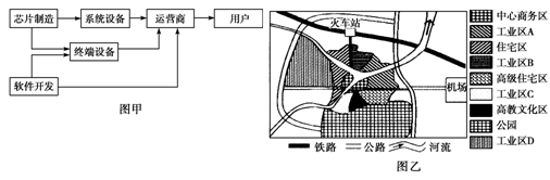 2、单选题 图甲为“某区域产业链示意图”,图乙为“某城市功能区分布图”。读图完成小题。
