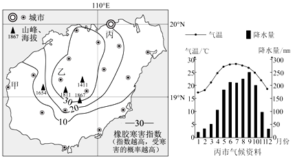 (1)比较甲、乙两地橡胶寒害指数的差异,并分析原因。(7分)