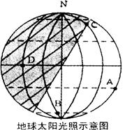 5、综合题 读“地球太阳光照示意图”(阴影部分表示黑夜),回答问题。(13分)