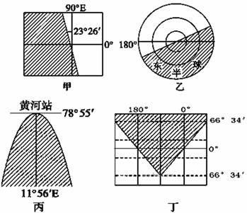 D.丁图显示的为冬至日,新的一天范围为180°向东至90°W
