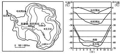 1、单选题  读南极洲等高线图(左图)和南极洲4个气象站气温曲线图(右图),回答下列小题。
