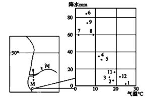 (2)图中M河流的上游地区汛期开始于6月份,O点以下的中游却是7-10月份为汛期。请分析其原因。(4分)