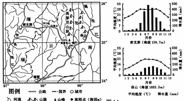 3、综合题 (16分)市场上商业品级的翡翠玉石95%以上来自缅甸,翡翠又称为缅甸玉。瑞丽是中国西南最大的内陆口岸,是重要的珠宝集散中心。图为中缅部分区域图及密支那和保山的气候统计图。读图完成下列问题。