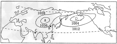 (1)填出图中气压中心的名称:A ?,D_______________。