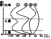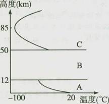 (3)B层为平流层,在30km存在臭氧层,吸收紫外线,气温高,故曲线为,12km至30km,气温不断升高。早30km至50km,不断降低。