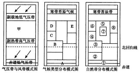 (1)“气压带与风带模式图”、“气候类型分布模式图”与“自然带分布模式图”之间的对应关系体现