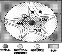 4、单选题 图中实线表示从市中心到城市各方向所需时间的等时线(单位:分钟),虚线表示距市中心的等距离线。读图完成第18题。