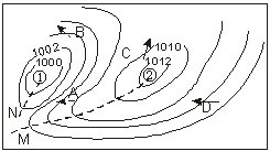 本题解析:本题考查等压线天气图分析。根据风向斜穿等压线由高压指向低压,并在北半球向右偏的原则判断C正确。图示M位于高压脊上,故不能形成锋面;N处为低压槽,可能形成锋面。画图判断N处锋面的性质为冷锋,冷锋过境常形成刮风、下雨、降温等天气过程。A处等压线较密,表示水平气压梯度力较大,风力较大。①处为低压控制,多阴雨天气,②处为高压控制,天气晴朗,故②处温差大。