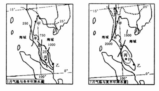 2、单选题 下图为东南亚某半岛气温(虚线,单位:℃)、降水(实线,单位:毫米)分布图,读图回答下列各题。