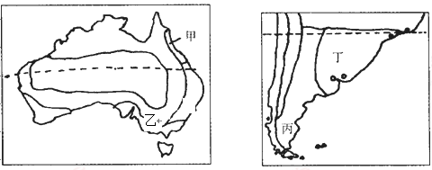 【小题2】与同纬度半岛东西两岸相比,丙地气温特点及其影响的主导因素分别是