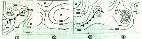 4、单选题 读图,由于气压高低的变化,使杭州四个季节呈现多变的现缘。下列天气图依照春夏秋冬季节的排序,正确的是( )