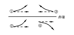 2、单选题 图中,虚线箭头表示水平运动物体的原始运动方向,实线箭头表示受地转偏向力影响后实际的运动向,图中所示四种情况,正确的是