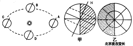 (1)在A、B、C、D四位置中,地球公转线速度最快的是_______,角速度最慢的是_______。