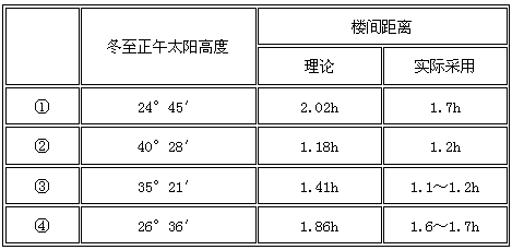 材料三:下列表格是我国部分城市,冬至正午太阳高度与住宅的楼间距离理论与实际值: