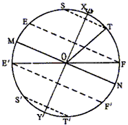 3、综合题 下图中XOY为地轴,MN为赤道,EF、E′F′为回归线,ST、S′T′为极圈。读图回答问题。