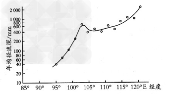 4、综合题 下图为中国部分区域多年平均径流深(径流深指计算时段内的径流总量平铺在水文观测站以上流域面积上所得的水层厚度)随经度的变化示意图,图中选取的是沿台湾—江西—四川— 青海等省一线水文观测站(图中小圆点)以上流域面积的数据。分析回答1、2题。