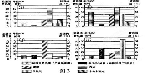 4、单选题 图3示意世界四个国家21世纪初期能源消费情况。读图回答问题。
