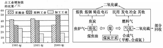 5、单选题 山西是我国煤炭输出最多的省区,随着煤炭深加工的发展,生产结构也发生了很大变化。读“山西省工业增加值结构示意图”和“山西某地煤炭资源开发和综合利用示意图”,完成下列各题。
