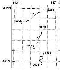 1、单选题 在地理研究中,可用重心移动反映地理事物和现象空间分布的变化,图表示我国1978-2005年能源生产总量、能源消费总量与GDP重心变化轨迹。完成11-12题。