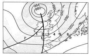 2、单选题 读8月份中纬度某地区海平面等压线图,回答问题。