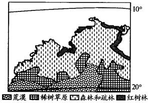 【小题3】红树林主要分布在南北纬25°之间的沿海滩涂,其他纬度也有零星分布。导致其他纬度有红树林分布的主导因素是 ( )