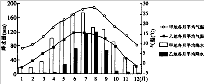 5、单选题 我国甲、乙两地均位于29。N附近。读“1971~2000年甲、乙两地各月气温和降水分布图”可知