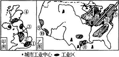 2、单选题 甲、乙两图分别为英国和美国工业分布示意图,读图回答下列各题。