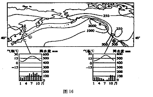 4、综合题 阅读北太平洋海域附近地区年降水量分布图(图16),回答下列问题。(13分