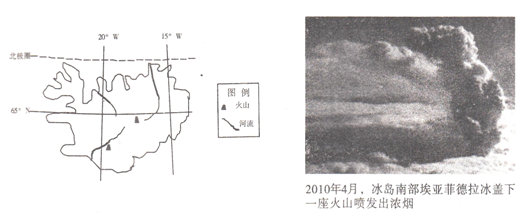 小题2:冰岛位于板块的生长边界,所以多火山,A错。冰岛位于西风带,火山灰向东飘,影响欧洲西部地区,不会影响美国,B错。冰岛火山喷发,岛上冰雪融化量大,可能引发洪水灾害,C对。根据岛上河流判断,地形是中间高,四周低,D错。