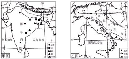 1、综合题 (8分)图幅大小相同的甲、乙两图分别为印度和意大利的地理简图,读图完成下列问题。