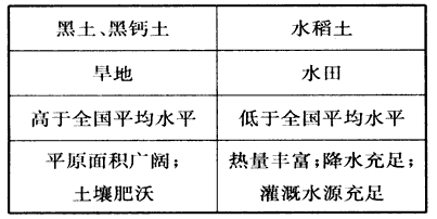 (2)从土地利用、农业地域类型及农业生产条件等方面比较甲、乙两地种植业分布区的差异:
