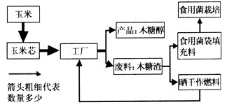 材料二:河南省汤阴县有30多万亩玉米,玉米芯资源丰富。近年来当地农民利用玉米芯生产木糖醇,建立相关产业。木糖醇生产后产生的下脚料—糖渣若堆放在田地或土坑中,因木糖渣很轻,在干旱季节容易造成严重的空气污染和水污染。但利用木糖渣代替棉籽壳做食用茵袋的填充料,可发展食用菌种植。现当地已形成几个食用茵栽培大乡(镇)。光靠栽培食用茵还不能消耗所有的木糖渣,当地企业又开发了用晒干的木糖渣代替燃煤技术,3吨干渣就能代替1吨煤,给企业节省了大量成本。在汤阴县,玉米芯的综合利用已形成了一条产业链,这条综合利用产业链总产值达7.3亿元左右,约占全县总产值的1/4。