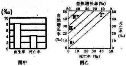 4、单选题 下图甲表示我国2008年某市人口出生率和死亡率,图乙为“我国不同阶段人口增长情况图”,读图回答下列各题。