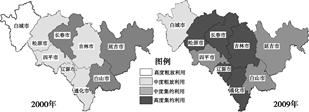 1、单选题 单位土地面积上投放的劳动力和资金多,产出多,则土地利用的集约度高,为集约利用;反之,土地利用集约度低,为粗放利用。下图是2000年和2009年吉林省土地集约利用程度区域差异图。读图回答问题。