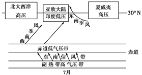 7月份,在北纬30°附近,由于亚欧大陆受热快,空气膨胀上升,近地面形成低气压,印度低压(又称亚洲低压)最为突出,使分布在此处的副热带高气压带被印度低压切断,使副热带高压只保留在海洋上,形成北太平洋上的高压中心(夏威夷高压)和北大西洋上的高压中心(亚速尔高压),这时受水平气压梯度力及地转偏向力影响,大气由北太平洋的高压中心吹向亚洲大陆,在东亚季风区表现为东南季风。对于南亚地区来说,由于太阳直射点的北移,位于赤道以南的东南信风跨过赤道,在地转偏向力的作用下向右偏形成西南季风,如下图。