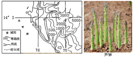 4、单选题 下图所示区域的沿海地区年降水量约50 毫米,东部山地雪线高度在4480—5000 米之间,自20 世纪90 年代,该地区开始种植芦笋(生长期耗水量较大),并发展成为世界上最大的芦笋出口区。回答以下问题。