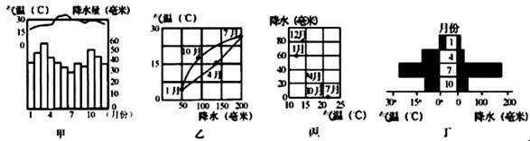 (1)读图,根据纬度位置,海陆位置判断,⑤是温带海洋性气候,根据气候资料判断,甲是热带雨林气候,A错。④是地中海气候,乙是亚热带季风气候,B错。⑥是温带季风气候,丁是温带季风气候,C对。⑦是亚热带季风气候,丙是地中海气候,D错。