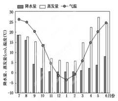 3、单选题 下图是我国某地区气温、降水量和蒸发量年内分布示意图,据此回答下列各题。