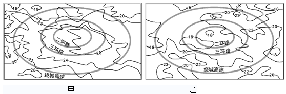 【小题1】甲图中城市东部温度最高,最大可能是工业密集,工厂排放废热多,导致温度上升,A错;乙图中城郊之间最低温度小于18℃,最高大于22℃,故最大温差大于4℃,B错;从图中等值线分析,二环内稳产最大,即温度变幅最大,C正确;因市区温度下降,热岛环流减弱,D错。