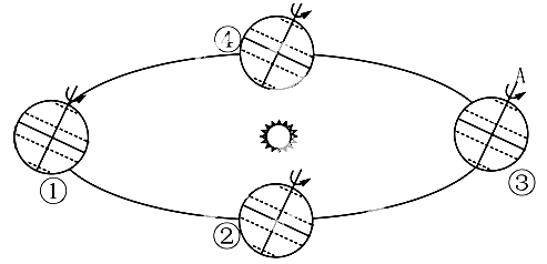 (1)在图^91考试网转轨道上画出地球的公转方向,在③位置画出晨昏线并用阴影表示夜半球。