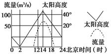 4、单选题 该图是“68°N某地在一天内太阳高度和该地某河流量变化示意图”,分析回答,由图可知,该河的主要补给形式是( )