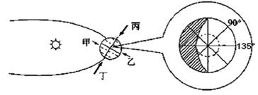 小题1:观测者从甲、乙、丙、丁四个角度能够观察到右图所示昼夜状况的是