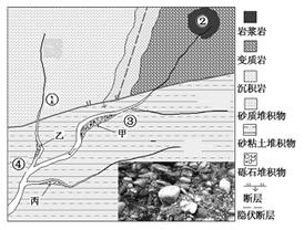 1、单选题 下图是某流域地质简图,甲、乙、丙三地有砾石堆积物(见下图右下角照片),读图回答下列问题。