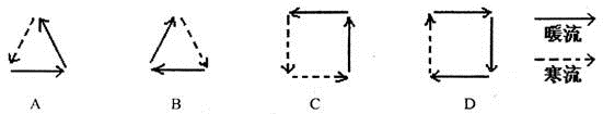 本题考查洋流的分布规律。洋流分布规律:①中低纬度海区形成以副热带高压为中心的大洋环流,北顺南逆;②北半球中高纬度海区形成以副极地低压为中心的逆时针大洋环流;③南纬40°附近海域形成环球性西风漂流。④北印度洋海区形成季风环流,夏顺冬逆。中低纬度大陆东岸为暖流,北半球中高纬度,大陆东岸为寒流。所以本题选择A选项。