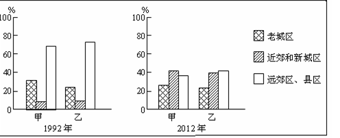 小题1:图形上只是展示的人口比例变化,并不决定人口数量的多少,虽然老城区人口比例略有减少,但该城市人口总量在逐渐增大,所以老城区人口不一定减少;从图中可以直接看出甲城市老城区人口比重变化幅度比乙城市大;远郊区两城市人口比例相当,但两城市人口总数比一定相同,其郊区人口总数可能有差别。选项D正确。