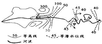 【小题2】在甲处的等潜水位线处,由高向低作垂线(如图)可以看出:从河流向两侧,等潜水位高度逐渐降低,说明河流处地下水位高,是河流对地下潜水起到了补给作用,即河水补给潜水。选B正确。