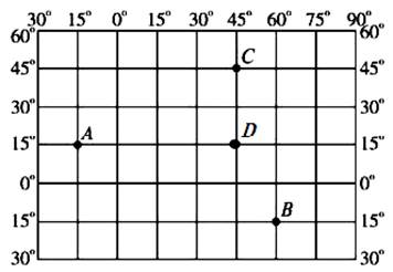 【小题2】根据经纬度的判断规律可以推断:B为(15°S,60°E),C为(45°N,45°E),D为(15°N,45°E),结合A点的经纬度是(15°N,15°E);所以A点位于B点西北;A点位于C点西南;A点位于D点正西;所有点都在北极点的正南方,故选项D正确。