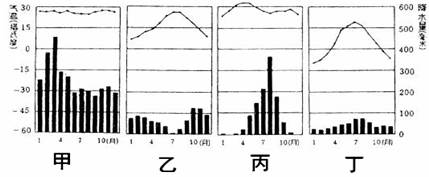小题2:丁地降水量及主要水汽来源组合,正确的是