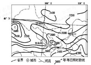 1.甲处年日照时数为2.影响甲、乙两地日照时数差异的最主要因素是